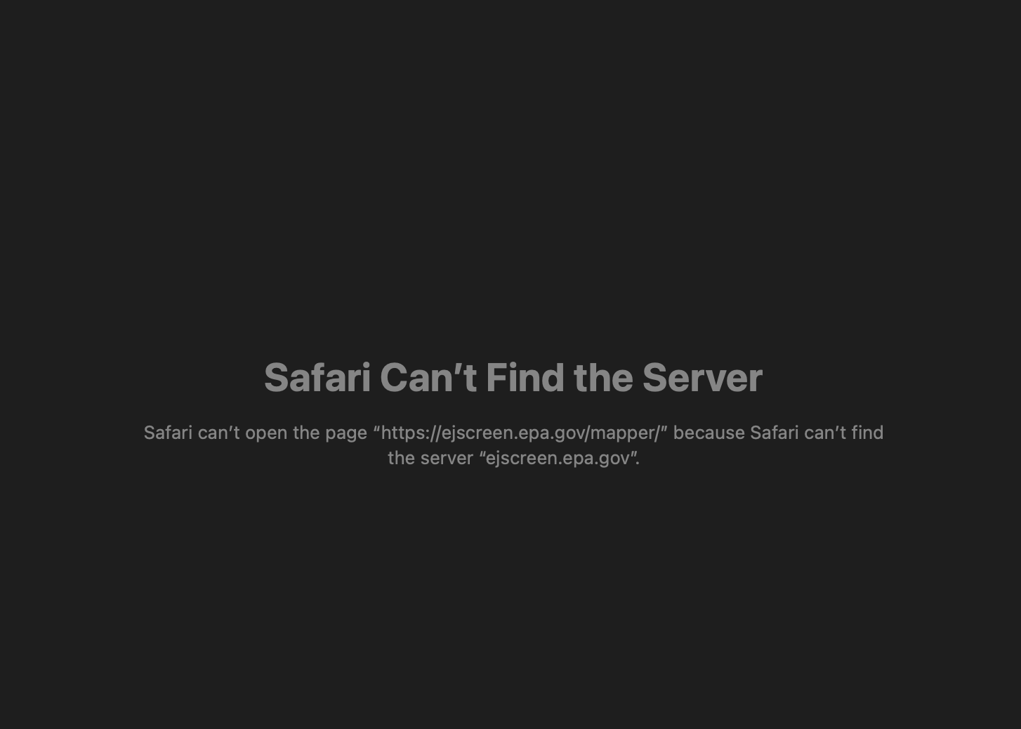 Screenshot shows: "Safari can't find the server 'ejscreen.epa.gov'" - Complete DNS resolution failure